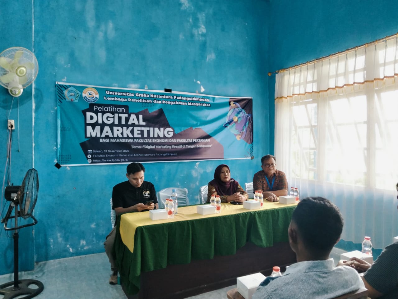 Kegiatan ini dibuka oleh Dekan Fakultas Ekonomi (Agustalinda Nora, S.E., S.Pd., M.M) dan dihadiri Ketua Lembaga Penelitian dan Pengabdian Masyarakat, Dekan Fakultas Pertanian, Narasumber dari Usaha Cap Bulang Padangsidimpuan. (Kampus II UGNP, Tanggal 3 Desember 2025).