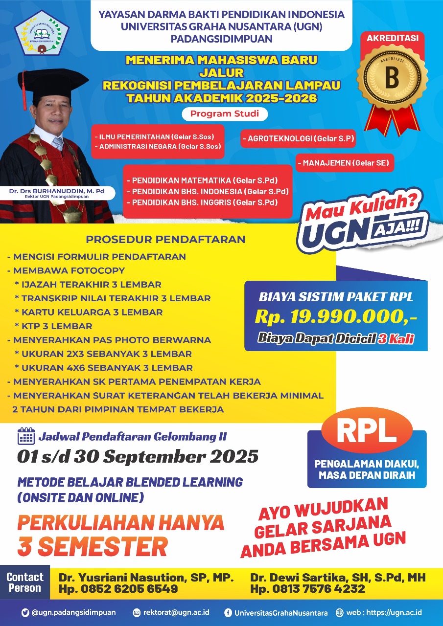 Penerimaan Mahasiswa Baru Program RPL (Rekonigsi Pembelajarn Lampau) Tahun Akademik 2025/2026, Program Studi Manajamen Fakultas Ekonomi UGNP. Bagi calon mahasiswa/i yang bekerja aktif bisa menyelesaikan kuliah dengan metode belajar secara Blended Learning (Onsite dan Online). Perkuliahan dilaksanakan secara efektif dan efisien hanya 3 semester, sehingga tidak menganggu calon mahasiswa/i yang sedang bekerja. Untuk keterangan pendaftaran Hubungi Kaprodi Manajemen Diana Sari Hp. 082160279639
